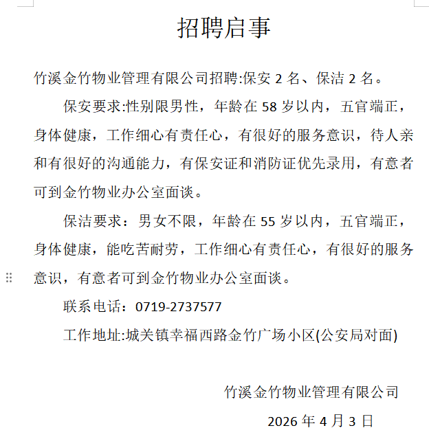 • 竹溪金竹物业招聘:保安2名、保洁2名。 保安要求:男性,年龄在58岁以内,五官端正,身体健康,工作细心,有责任心,有很好的服务意识,待人亲和有很好的沟通能力,有保安证、消防证优先录用。 保洁要求:男女不限,年龄在55岁以内,五官端正,身体健康,能吃苦耐劳,工作细心,有责任心,有很好的服务意识。 有意者可到金竹物业办公室面谈。联系电话:0719-2737577