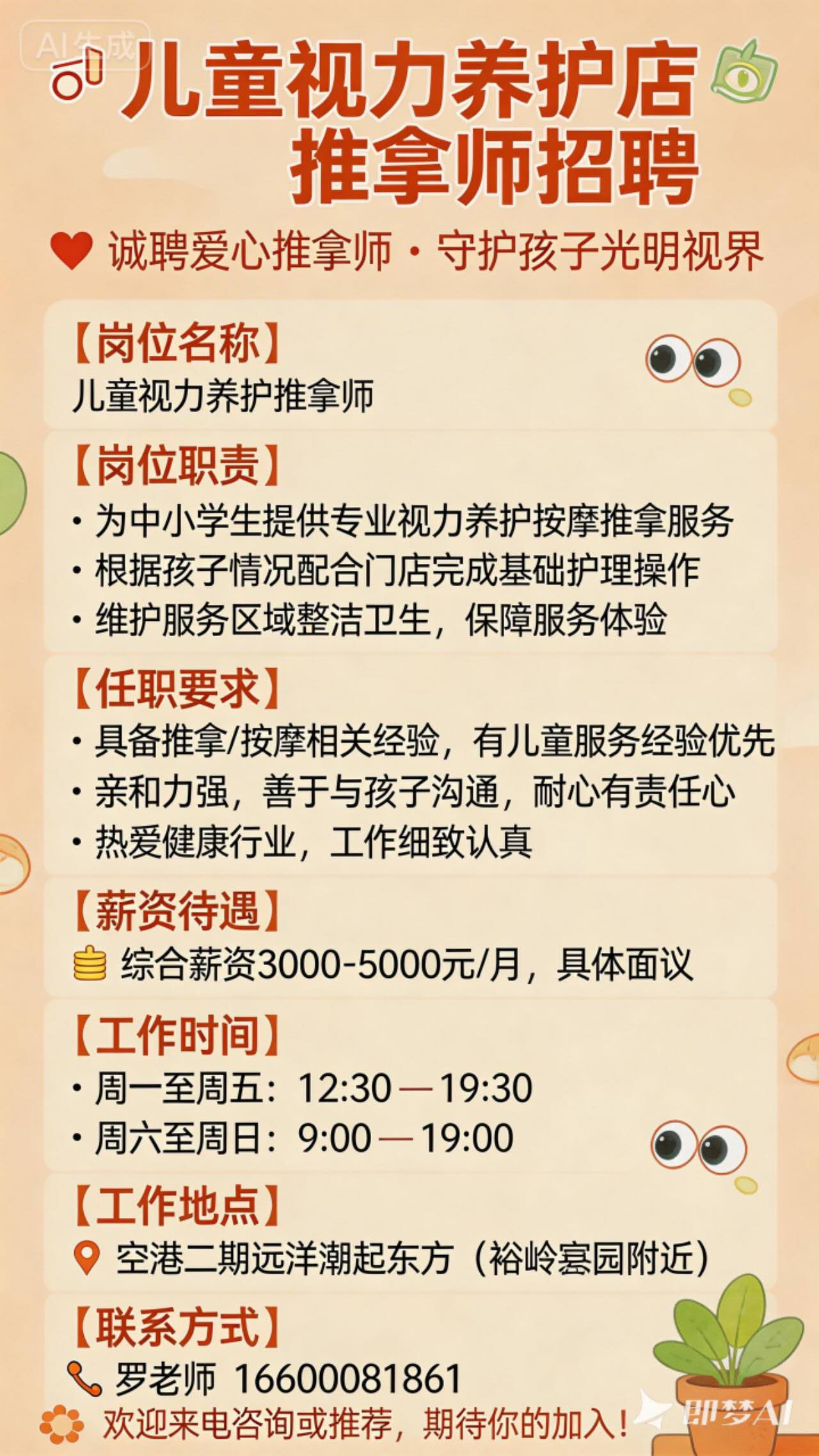 本店诚招一名视力养护推拿师,无经验要求,男女不限,薪资面议,急招!!!